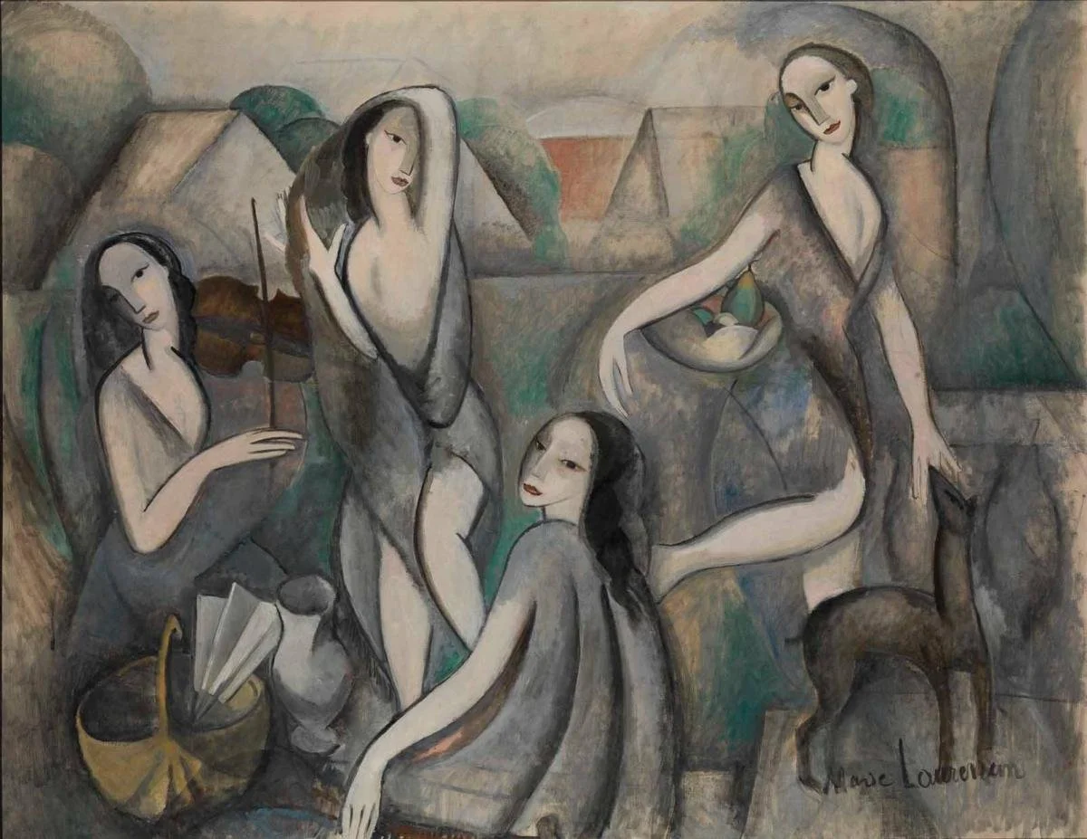 Laurencin created a distinctive visual language centred on female and lesbian identity, often depicting women in autonomous, harmonious settings using pastel hues and simplified forms. By distilling her subjects to their essential elements and embracing traditionally feminine visual motifs, Laurencin offered a powerful alternative to male-dominated modernist approaches.